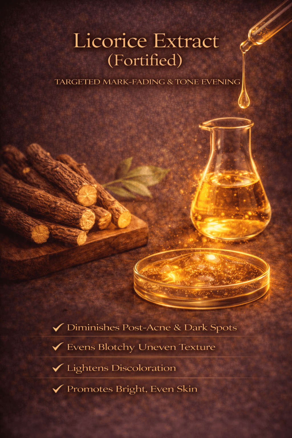 🤍 Licorice Root Extract (Fortified) – Supports fading of dark spots, post-acne marks and uneven patches.