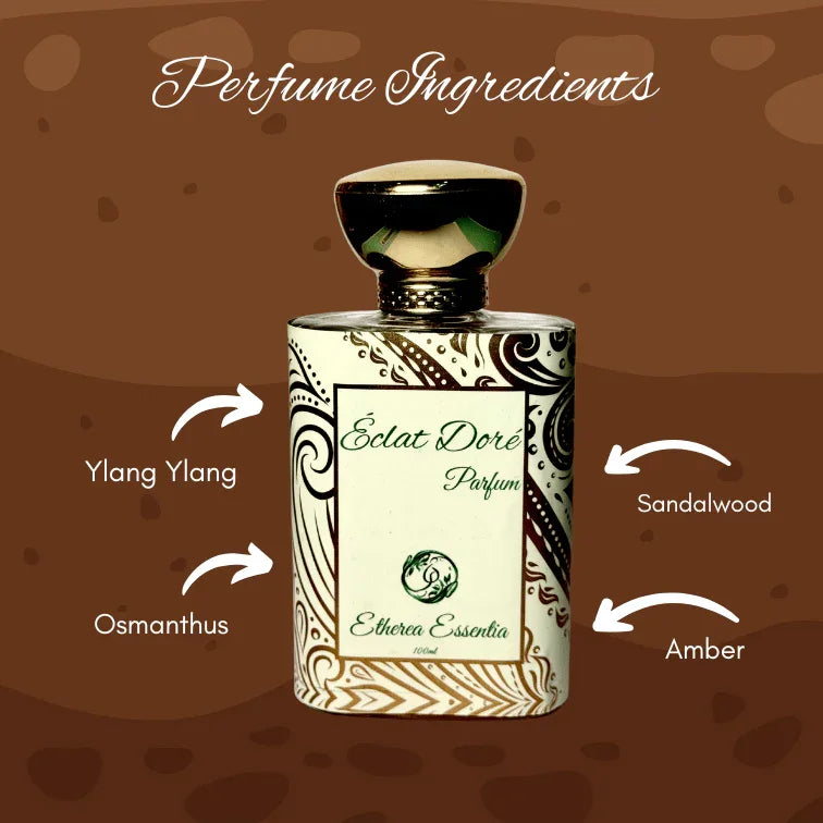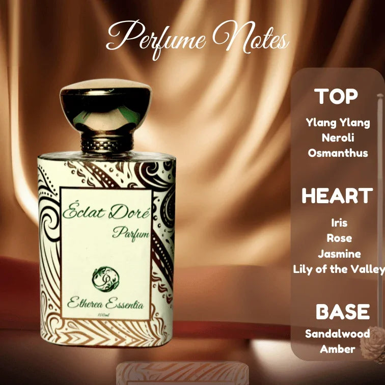 Éclat Doré opens with a sparkling blend of exotic ylang ylang and fresh neroli, awakening your senses with their vibrant and uplifting notes. As it evolves, a romantic heart of rose and intoxicating jasmine envelops you, with a soft touch of iris adding an elegant, powdery nuance. The scent deepens into a rich base of creamy sandalwood, warm vanilla, and a sweet embrace of balsamic amber, leaving a luxurious and lasting impression