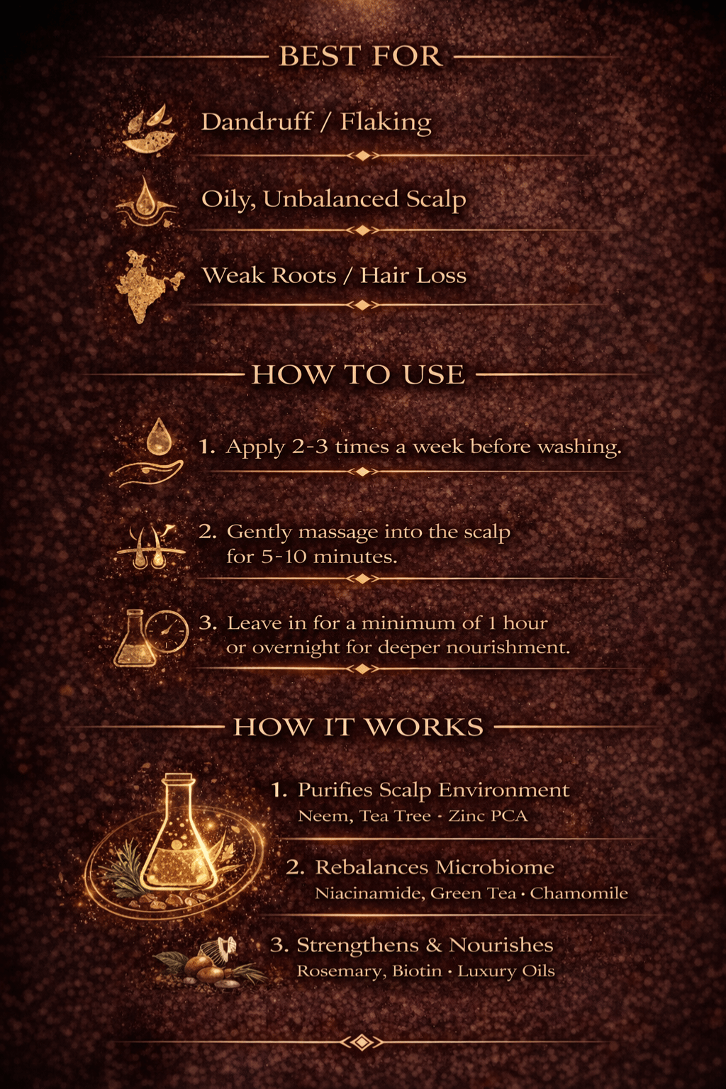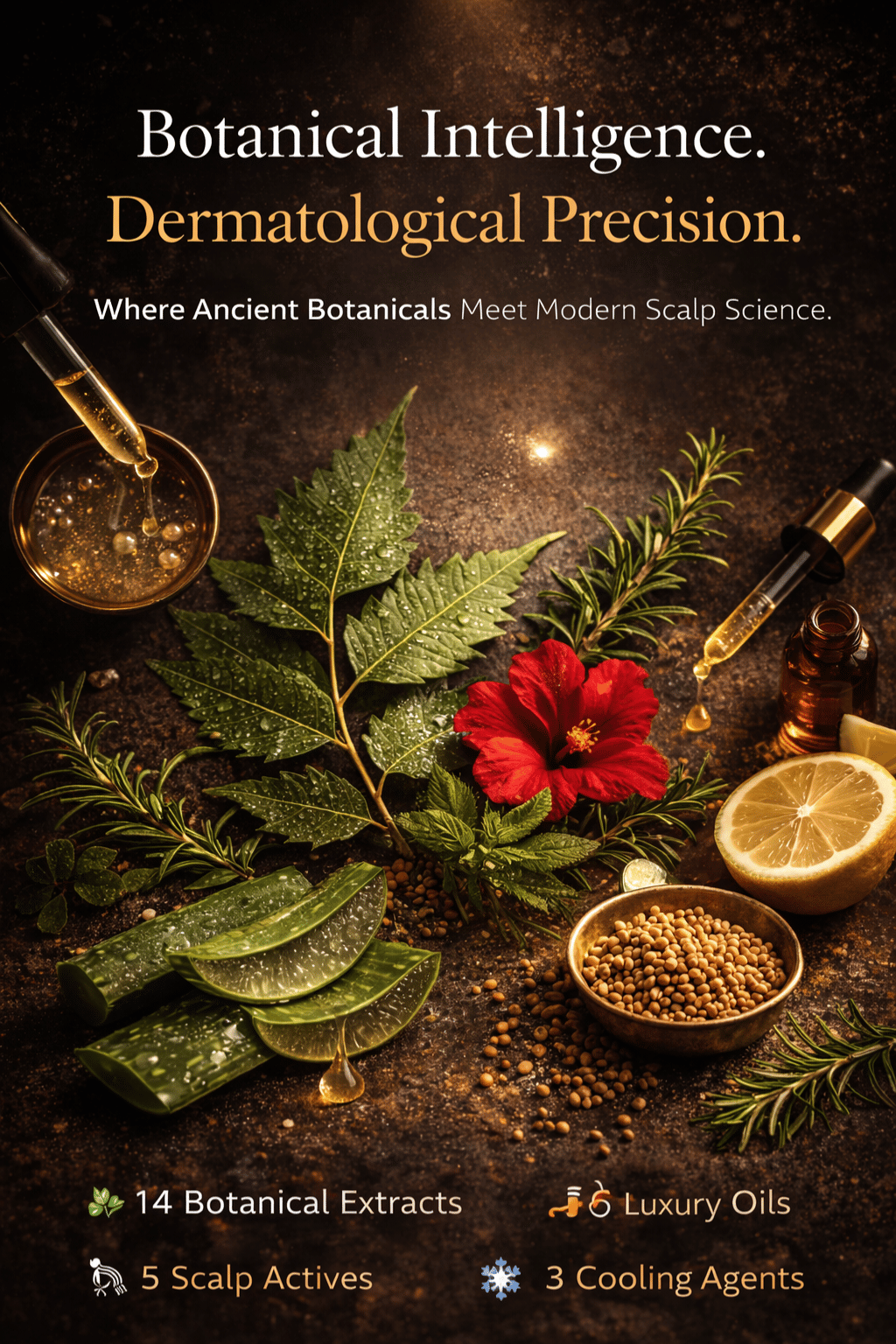 🧪 30+ premium botanicals & actives 🌿 Multi-category formulation for complete scalp transformation 💎 Luxury oils + dermatological scalp actives 🌱 Botanical-first, clean & skin-friendly ⚖️ Targets dandruff, irritation, oil imbalance & weak roots together